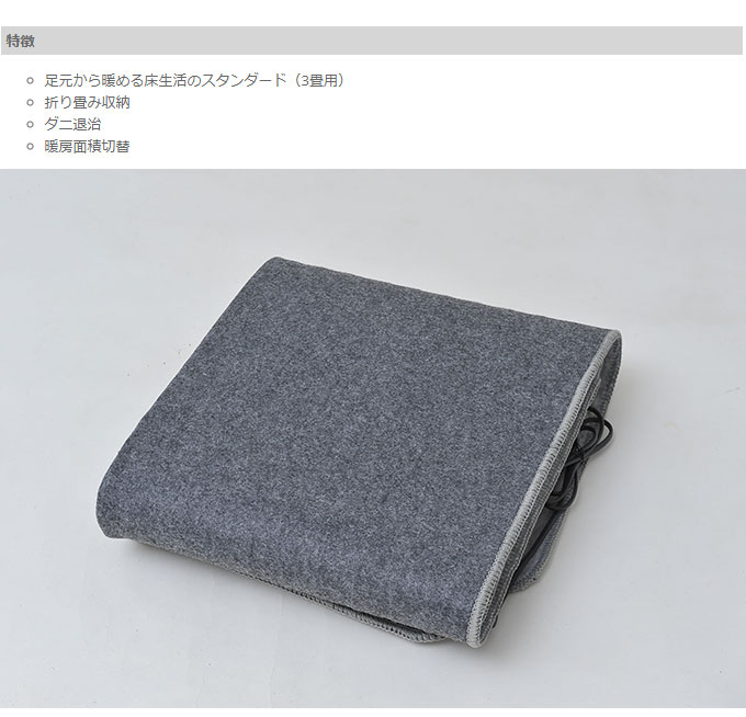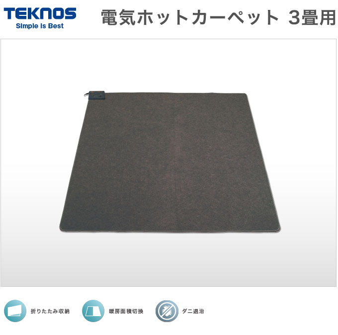 【商品名】ホットカーペット 3畳用本体 TWA-3000B【メーカー】TEKNOS 千住【仕様】消費電力:720W素材:ポリエステル100%表面温度:45℃(強)電気代:約6.3円/時サイズ:195×235cmコード:約1.5m色:ダークグレー【その他】大好評!! 足元から暖める床生活のスタンダード(2畳用)折り畳み収納ダニ退治暖房面積切替※本体表面温度は、当社のカーペットカバー(マイヤー)をかけて室温20℃で畳の上にカーペットを広げ、3kgの荷重を加えた状態での測定値です。